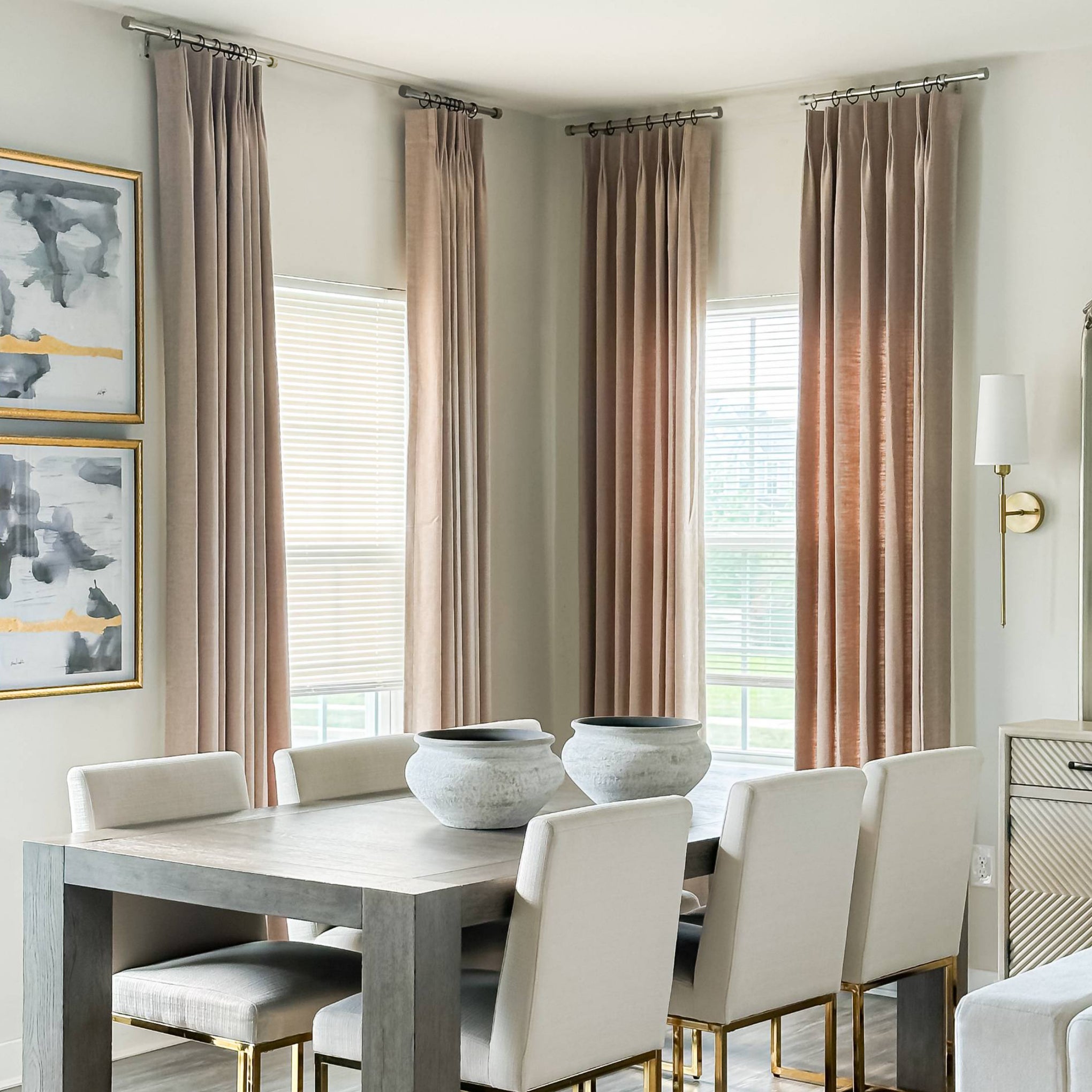Since they’re decorative, you can often use shorter rods—a refined look with less cost. Panel width depends on pleat count and stacked width: see our stacking guide to find the ideal single panel order width for your space.